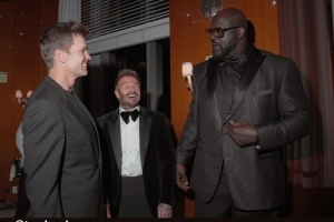 贝克汉姆在社交媒体上晒出与奥尼尔、布雷迪(传奇四分卫)的合照,配文:“我的个子可真小。”